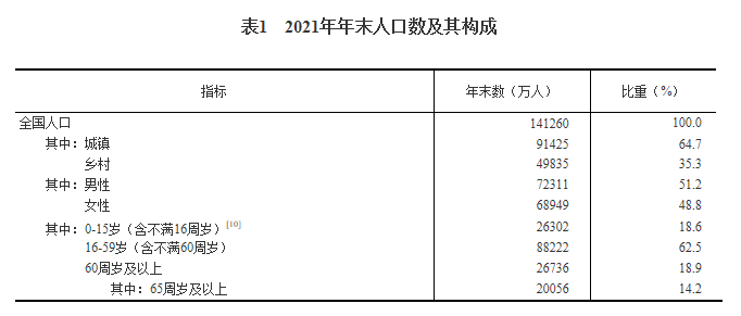 年末全国人口[7]141260万人,比上年末增加48万人,其中城镇常住人口91425万人。全年出生人口1062万人,出生率为7.52‰;死亡人口1014万人,死亡率为7.18‰;自然增长率为0.34‰。全国人户分离的人口[8]5.04亿人,其中流动人口[9]3.85亿人。