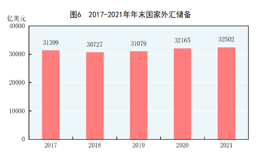 年末国家外汇储备32502亿美元,比上年末增加336亿美元。全年人民币平均汇率为1美元兑6.4515元人民币,比上年升值6.9%。