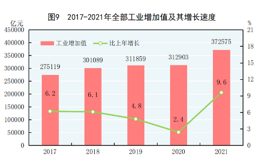 全年全部工业增加值372575亿元,比上年增长9.6%。规模以上工业增加值增长9.6%。在规模以上工业中,分经济类型看,国有控股企业增加值增长8.0%;股份制企业增长9.8%,外商及港澳台商投资企业增长8.9%;私营企业增长10.2%。分门类看,采矿业增长5.3%,制造业增长9.8%,电力、热力、燃气及水生产和供应业增长11.4%。