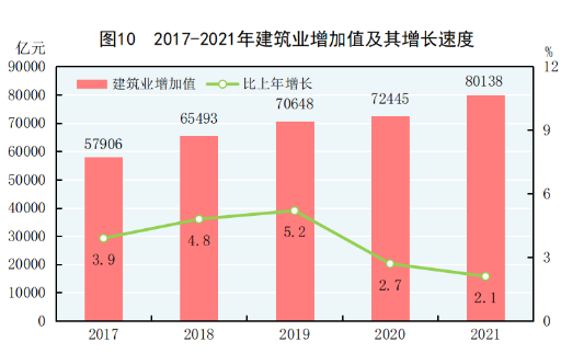 全年建筑业增加值80138亿元,比上年增长2.1%。全国具有资质等级的总承包和专业承包建筑业企业利润8554亿元,比上年增长1.3%,其中国有控股企业3620亿元,增长8.0%。