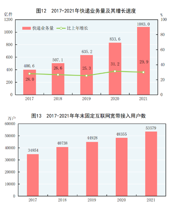 全年完成邮政行业业务总量[30]13698亿元,比上年增长25.1%。邮政业全年完成邮政函件业务10.9亿件,包裹业务0.2亿件,快递业务量1083.0亿件,快递业务收入10332亿元。全年完成电信业务总量[31]16960亿元,比上年增长27.8%。年末移动电话基站数[32]996万个,其中4G基站590万个,5G基站143万个。全国电话用户总数182353万户,其中移动电话用户164283万户。移动电话普及率为116.3部/百人。固定互联网宽带接入用户[33]53579万户,比上年末增加5224万户,其中固定互联网光纤宽带接入用户[34]50551万户,增加5136万户。蜂窝物联网终端用户[35]13.99亿户,增加2.64亿户。互联网上网人数10.32亿人,其中手机上网人数[36]10.29亿人。互联网普及率为73.0%,其中农村地区互联网普及率为57.6%。全年移动互联网用户接入流量2216亿GB,比上年增长33.9%。全年软件和信息技术服务业[37]完成软件业务收入94994亿元,按可比口径计算,比上年增长17.7%。