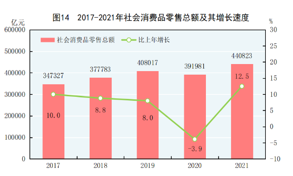 全年社会消费品零售总额440823亿元,比上年增长12.5%。按经营地统计,城镇消费品零售额381558亿元,增长12.5%;乡村消费品零售额59265亿元,增长12.1%。按消费类型统计,商品零售额393928亿元,增长11.8%;餐饮收入额46895亿元,增长18.6%。