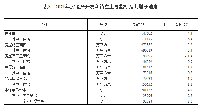全年房地产开发投资147602亿元,比上年增长4.4%。其中住宅投资111173亿元,增长6.4%;办公楼投资5974亿元,下降8.0%;商业营业用房投资12445亿元,下降4.8%。年末商品房待售面积51023万平方米,比上年末增加1173万平方米,其中商品住宅待售面积22761万平方米,增加381万平方米。