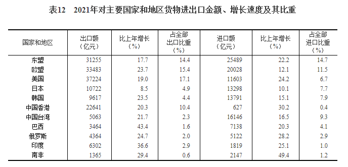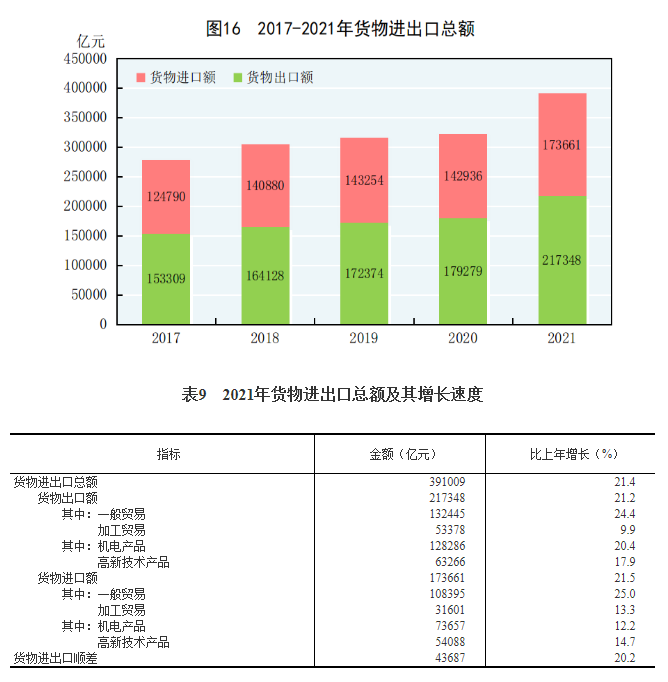 全年货物进出口总额391009亿元,比上年增长21.4%。其中,出口217348亿元,增长21.2%;进口173661亿元,增长21.5%。货物进出口顺差43687亿元,比上年增加7344亿元。对“一带一路”[44]沿线国家进出口总额115979亿元,比上年增长23.6%。其中,出口65924亿元,增长21.5%;进口50055亿元,增长26.4%。
