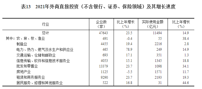 全年外商直接投资(不含银行、证券、保险领域)新设立企业47643家,比上年增长23.5%。实际使用外商直接投资金额11494亿元,增长14.9%,折1735亿美元,增长20.2%。其中“一带一路”沿线国家对华直接投资(含通过部分自由港对华投资)新设立企业5336家,增长24.3%;对华直接投资金额743亿元,增长29.4%,折112亿美元,增长36.0%。全年高技术产业实际使用外资3469亿元,增长17.1%,折522亿美元,增长22.1%。