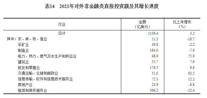 全年对外非金融类直接投资额7332亿元,比上年下降3.5%,折1136亿美元,增长3.2%。其中,对“一带一路”沿线国家非金融类直接投资额203亿美元,增长14.1%。