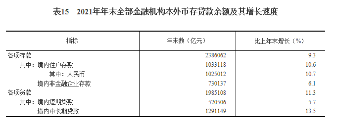 本公报中城镇新增就业、城镇登记失业率、养老保险、失业保险、工伤保险、技工学校数据来自人力资源和社会保障部;外汇储备、汇率数据来自国家外汇管理局;市场主体、质量检验、国家标准制定修订、制造业产品质量合格率数据来自国家市场监督管理总局;环境监测等数据来自生态环境部;水产品产量、新增高效节水灌溉面积数据来自农业农村部;木材产量、造林面积、种草改良面积、国家级自然保护区、国家公园数据来自国家林业和草原局;新增耕地灌溉面积、水资源总量、用水量、新增水土流失治理面积数据来自水利部;发电装机容量、新增220千伏及以上变电设备、电力消费量数据来自中国电力企业联合会;港口货物吞吐量、港口集装箱吞吐量、公路运输、水路运输、新改建高速公路里程、港口万吨级码头泊位新增通过能力数据来自交通运输部;铁路运输、新建铁路投产里程、增新建铁路复线投产里程、电气化铁路投产里程数据来自中国国家铁路集团有限公司;民航运输、新增民用运输机场数据来自中国民用航空局;管道运输数据来自中国石油天然气集团有限公司、中国石油化工集团有限公司、中国海洋石油集团有限公司、国家石油天然气管网集团有限公司;民用汽车保有量、道路交通事故数据来自公安部;邮政业务数据来自国家邮政局;通信业、软件业务收入、新增光缆线路长度等数据来自工业和信息化部;互联网上网人数、互联网普及率数据来自中国互联网络信息中心;棚户区改造、保障性租赁住房数据来自住房和城乡建设部;货物进出口数据来自海关总署;服务进出口、外商直接投资、对外直接投资、对外承包工程、对外劳务合作等数据来自商务部;财政数据来自财政部;新增减税降费数据来自国家税务总局;货币金融、公司信用类债券数据来自中国人民银行;境内交易场所筹资数据来自中国证券监督管理委员会;保险业数据来自中国银行保险监督管理委员会;医疗保险、生育保险数据来自国家医疗保障局;城乡低保、农村特困人员救助供养、临时救助、民政服务数据来自民政部;优抚对象数据来自退役军人事务部;国家自然科学基金资助项目数据来自国家自然科学基金委员会;国家重点实验室、国家科技成果转化引导基金、国家级科技企业孵化器、国家备案众创空间、技术合同等数据来自科学技术部;国家工程研究中心、国家企业技术中心、大众创业万众创新示范基地等数据来自国家发展和改革委员会;专利、商标数据来自国家知识产权局;宇航发射数据来自国家国防科技工业局;教育数据来自教育部;艺术表演团体、博物馆、公共图书馆、文化馆、旅游数据来自文化和旅游部;电视、广播数据来自国家广播电视总局;电影数据来自国家电影局;报纸、期刊、图书数据来自国家新闻出版署;档案数据来自国家档案局;医疗卫生数据来自国家卫生健康委员会;体育数据来自国家体育总局;残疾人运动员数据来自中国残疾人联合会;国有建设用地供应、海洋灾害造成直接经济损失数据来自自然资源部;平均气温、台风登陆数据来自中国气象局;农作物受灾面积、洪涝和地质灾害造成直接经济损失、干旱灾害造成直接经济损失、低温冷冻和雪灾造成直接经济损失、地震次数、地震灾害造成直接经济损失、森林火灾、受害森林面积、生产安全事故数据来自应急管理部;其他数据均来自国家统计局。