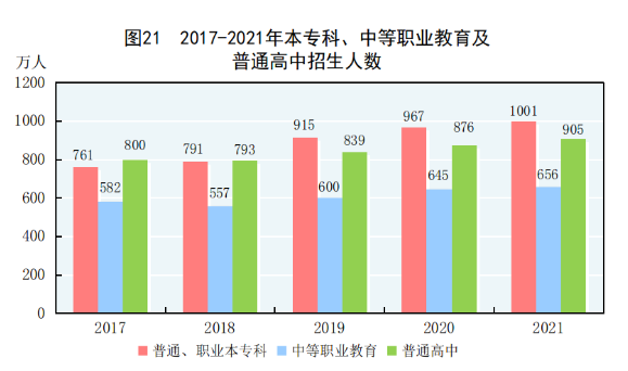 [65]普通、职业本专科包括普通本科、职业本科、高职(专科)。2021年高职(专科)招生人数统计口径发生变化,包含五年制高职转入专科招生人数。