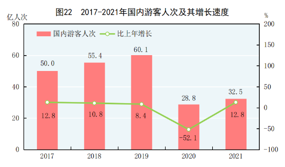 全年国内游客32.5亿人次,比上年增长12.8%。其中,城镇居民游客23.4亿人次,增长13.4%;农村居民游客9.0亿人次,增长11.1%。国内旅游收入29191亿元,增长31.0%。其中,城镇居民游客花费23644亿元,增长31.6%;农村居民游客花费5547亿元,增长28.4%。