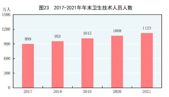 年末全国共有医疗卫生机构103.1万个,其中医院3.7万个,在医院中有公立医院1.2万个,民营医院2.5万个;基层医疗卫生机构97.7万个,其中乡镇卫生院3.5万个,社区卫生服务中心(站)3.6万个,门诊部(所)30.7万个,村卫生室59.9万个;专业公共卫生机构1.3万个,其中疾病预防控制中心3380个,卫生监督所(中心)2790个。年末卫生技术人员1123万人,其中执业医师和执业助理医师427万人,注册护士502万人。医疗卫生机构床位957万张,其中医院748万张,乡镇卫生院144万张。全年总诊疗人次[70]85.3亿人次,出院人数[71]2.4亿人。截至年末,全国累计报告新型冠状病毒肺炎确诊病例102314例,累计治愈出院病例94792例,累计死亡4636人。全国累计报告接种新型冠状病毒疫苗283533万剂次。全国共有11937家医疗卫生机构提供新型冠状病毒核酸检测服务,总检测能力达到4168万份/天。