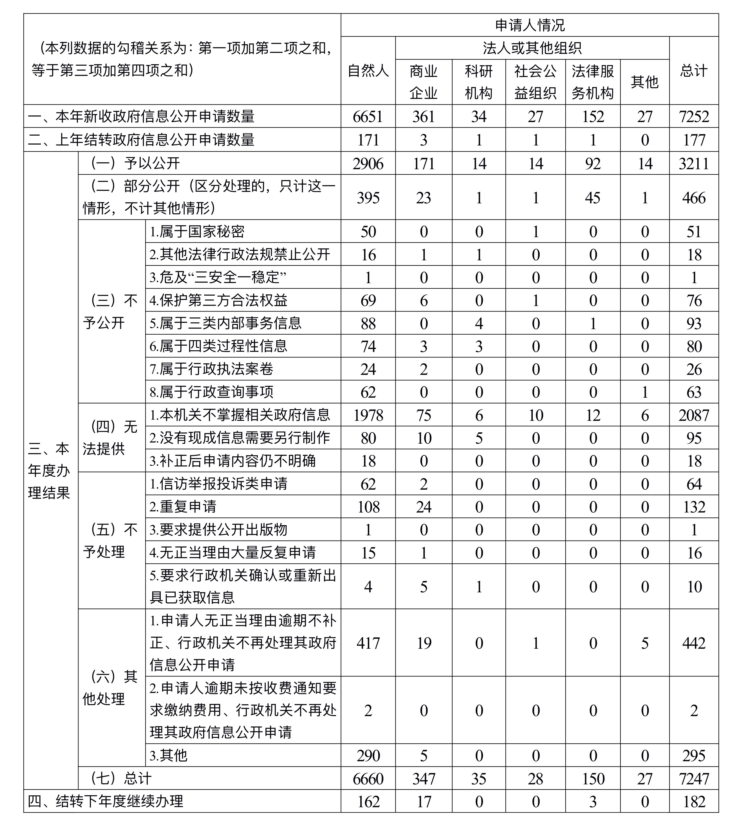 2021年,全省共受理公民、法人和其他组织提出的政府信息公开申请7252件,办理上年度结转177件;当年办理7247件,结转下年度办理182件。处理涉及信息公开行政复议186件,行政诉讼356件。在办理政府信息公开申请过程中,按照为申请人获取政府信息提供便利的原则,最大限度向申请人提供信息,帮助解决难题。
