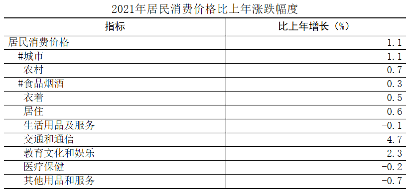 全年居民消费价格比上年上涨1.1%。其中,城市价格上涨1.1%,农村价格上涨0.7%。