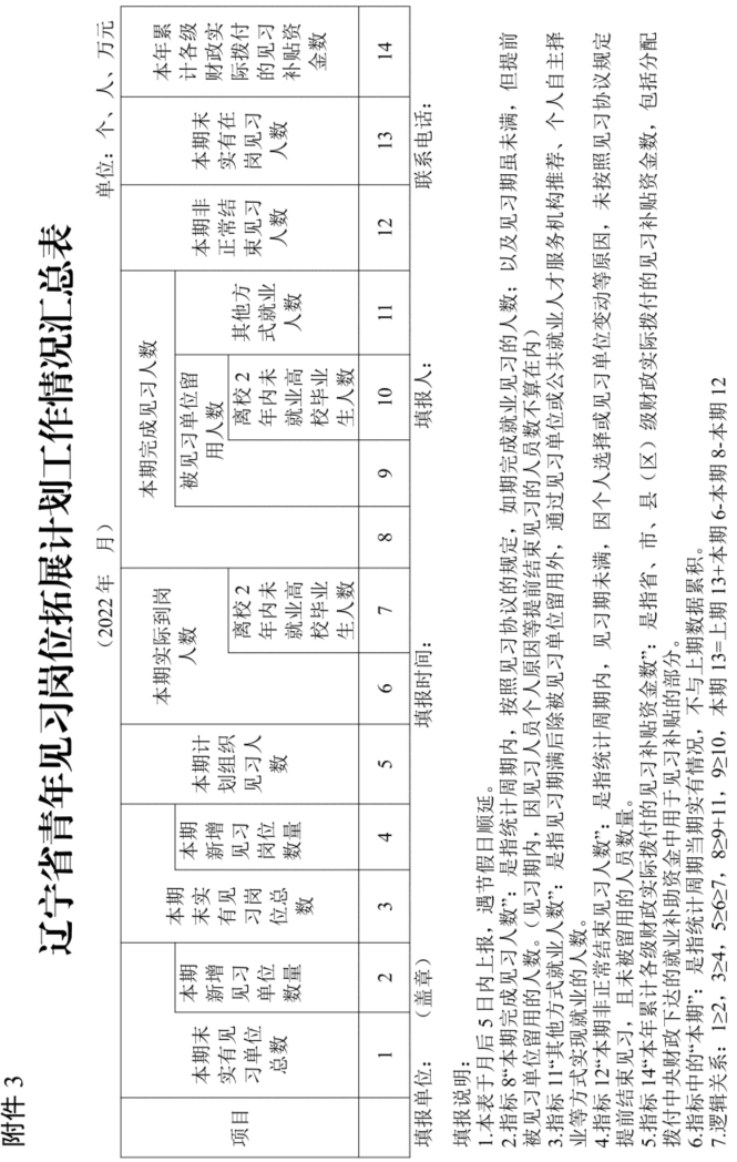 (四)做好统计汇总。计划实施后,各地要建立健全见习单位和岗位信息数据库(见附件2),各地工作报表信息须与数据库相符。请各地按月填报《辽宁省青年见习岗位拓展计划工作情况汇总表》(见附件3),连同本期见习单位和岗位信息数据库(Excel格式),于下个月的前4日报省大学生就业创业中心,原《青年就业见习工作情况汇总表》不再填报。