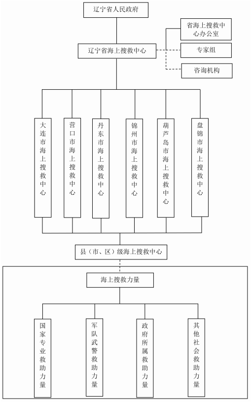 辽宁省海上搜救组织体系由辽宁省海上搜救中心(以下简称省海上搜救中心),市、县级海上搜救中心,专家组和咨询机构,海上搜救力量等组成。