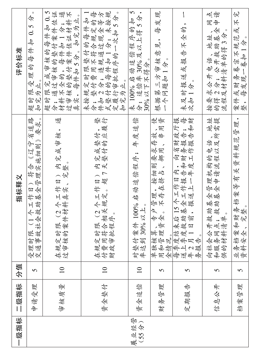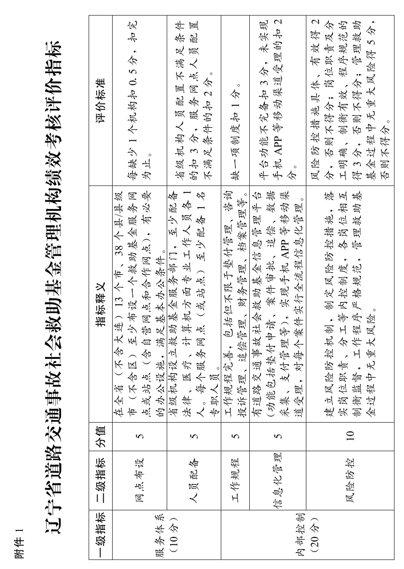 附件:1.辽宁省道路交通事故社会救助基金管理机构绩效考核评价指标