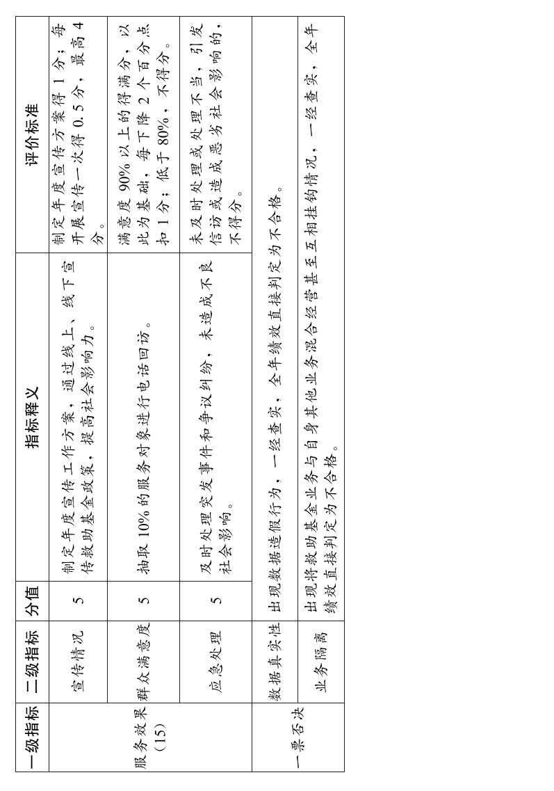 第二条 本办法通过建立考核评价指标体系,按照相应的指标释义、评价标准以及收集的相关材料等,对救助基金管理机构一个年度的服务体系、内控制度、展业经营、服务效果等进行综合考评。
