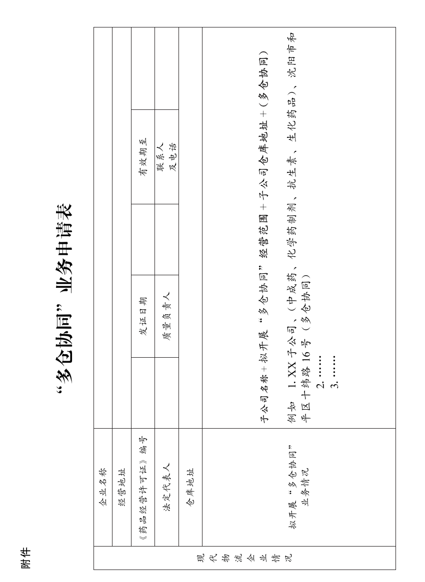 第三十五条 办理“多仓协同”业务的,第三方物流企业应当向辽宁省药品监督管理局提出申请,填写《“多仓协同”业务申请表》(见附件),由辽宁省药品监督管理局组织实施现场检查,符合规定的,在其《药品经营许可证》中标注增加的仓库地址,格式为“仓库X:XX市XX区XX路XX号(多仓协同)”。