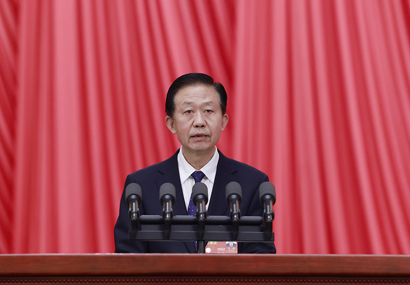 3月7日,十四届全国人大一次会议在北京人民大会堂举行第二次全体会议。受十三届全国人大常委会委托,栗战书委员长向大会报告全国人大常委会工作。