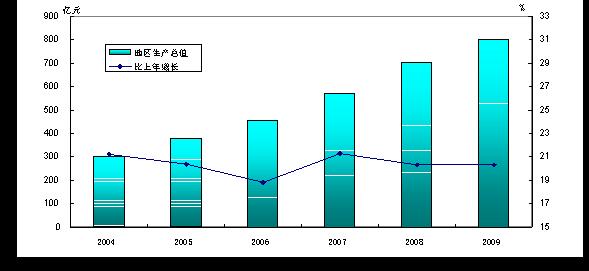 国民经济保持较快增长。初步核算,全年实现生产总值799.5亿元,按可比价格计算,比上年增长20.3%。分产业看,第一产业增加值67.5亿元,增长7.9%,第二产业增加值447.0亿元,增长22.3%,第三产业增加值285.0亿元,增长19.9%。三次产业增加值占生产总值的比重为8.45:55.9:35.65。人均生产总值34104元,按可比价格计算,比上年增长19.6%。