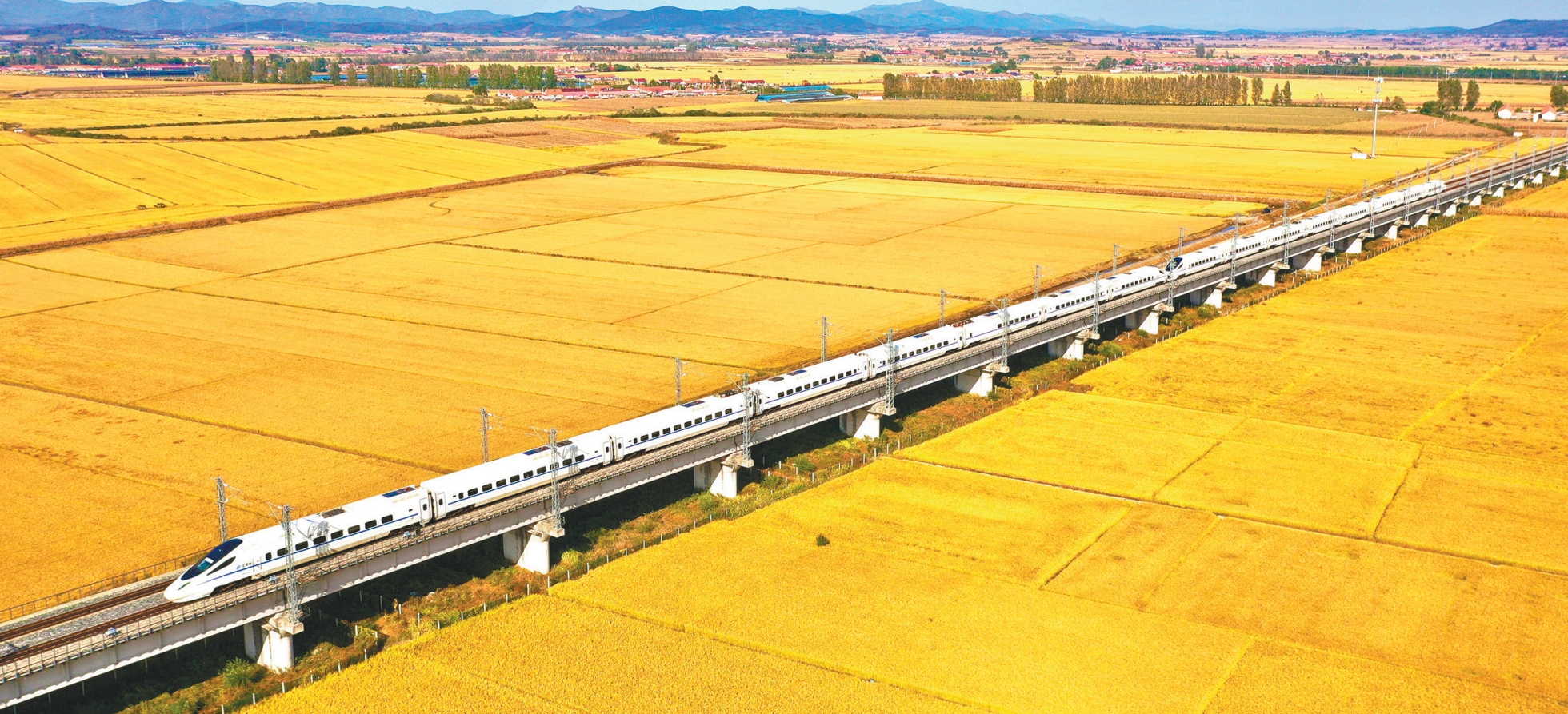 眼下,我省大部分地区的水稻即将迎来收割期。各地实施选育良种、科学田间管理等措施,水稻丰产稳产已成定局。图为10月14日,一列高铁在大连庄河市一片金色的稻田间行驶,为千重稻浪增添了一份灵动。