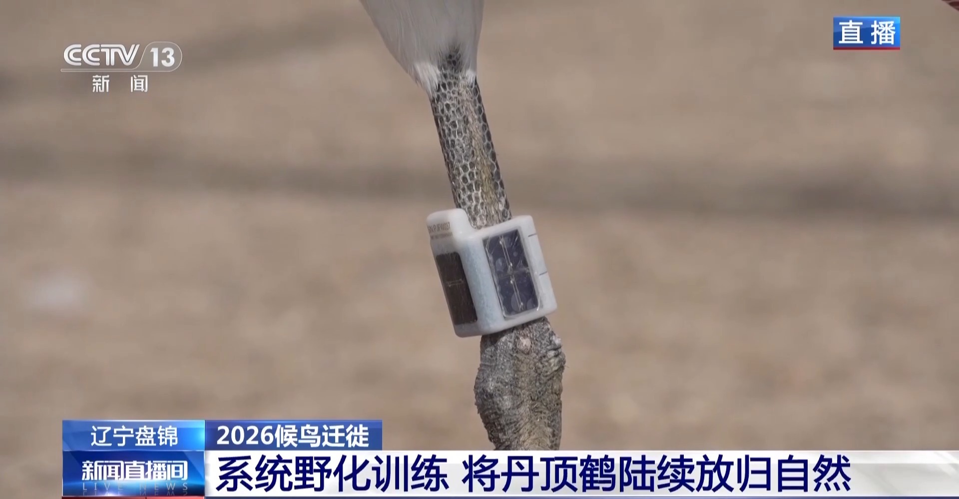 右腿上是带有太阳能板的轻量化卫星定位追踪器,重量只有30多克,不会影响丹顶鹤的正常活动,它将在接下来的几年时间里持续工作,为科研人员采集传输丹顶鹤觅食、栖息活动区域,以及迁徙路线等重要数据信息。