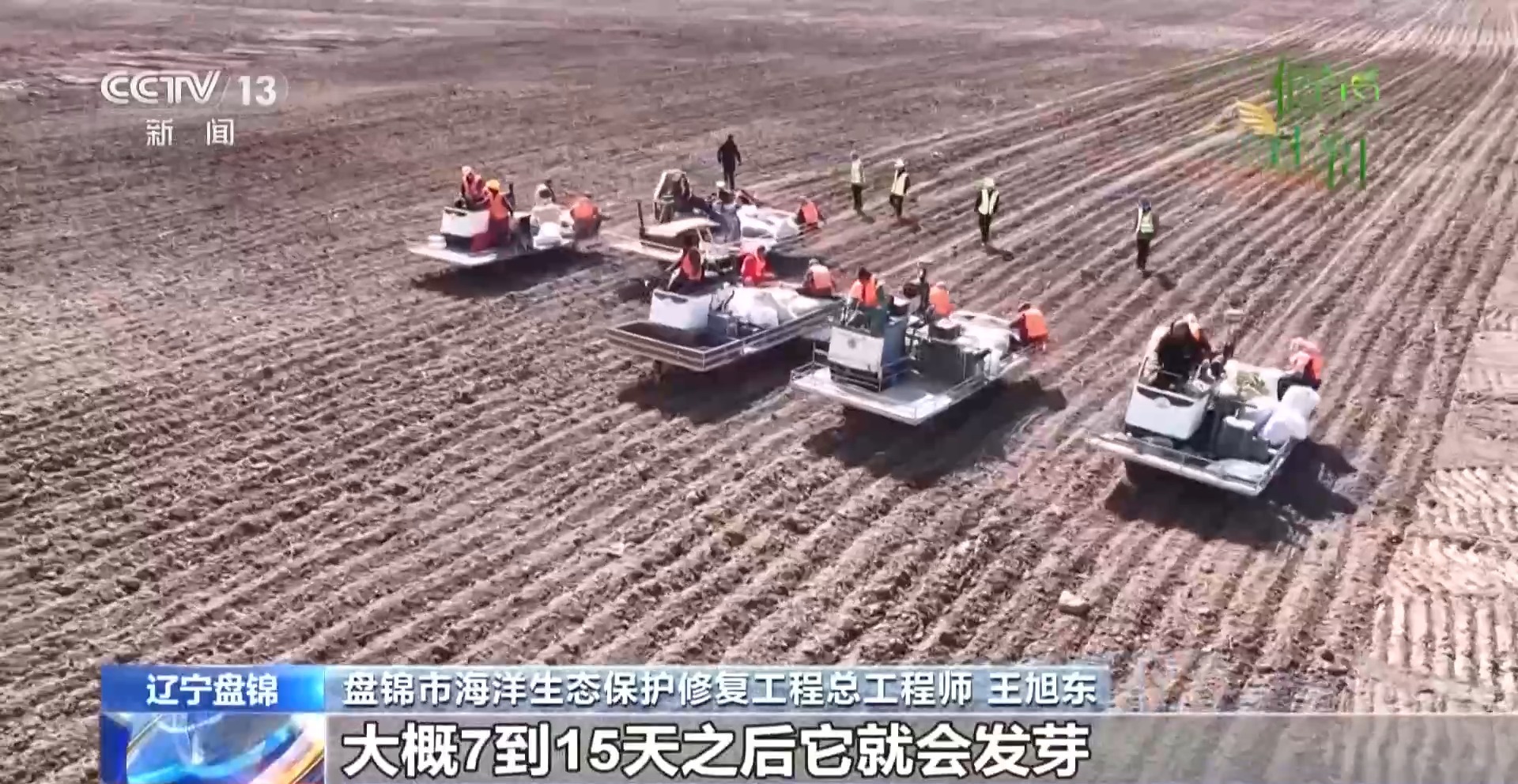 盘锦市海洋生态保护修复工程总工程师 王旭东:这里原本是很多承包的养殖池。根据项目要求,我们已对大量养殖池及围堰进行平整,相当于退养还湿。现在正在进行碱蓬播种施工,碱蓬对改良土壤盐碱度有很大的好处,大概是每平方米播种35克草种,每亩23公斤左右,大概7至15天之后就会发芽。
