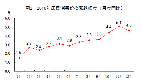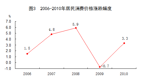 居民消费价格一季度同比上涨2.2%,二季度上涨2.9%,三季度上涨3.5%,四季度上涨4.7%,全年平均比上年上涨3.3%,其中食品价格上涨7.2%。固定资产投资价格上涨3.6%。工业品出厂价格上涨5.5%。原材料、燃料、动力购进价格上涨9.6%。农产品生产价格上涨10.9%。