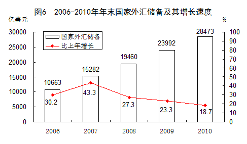 年末国家外汇储备28473亿美元,比上年末增加4481亿美元。年末人民币汇率为1美元兑6.6227元人民币,比上年末升值3.0%。