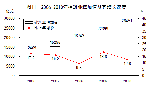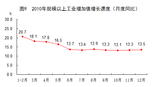 全年规模以上工业中,农副食品加工业增加值比上年增长15.0%;纺织业增长11.6%;通用设备制造业增长21.7%;专用设备制造业增长20.6%;交通运输设备制造业增长22.4%,其中汽车制造增长24.8%,铁路运输设备制造增长25.4%;通信设备、计算机及其他电子设备制造业增长16.9%;电气机械及器材制造业增长18.7%。六大高耗能行业[4]比上年增长13.5%,其中,非金属矿物制品业增长20.3%,化学原料及化学制品制造业增长15.5%,有色金属冶炼及压延加工业增长13.2%,黑色金属冶炼及压延加工业增长11.6%,电力、热力的生产和供应业增长11.0%,石油加工、炼焦及核燃料加工业增长9.6%。高技术制造业增加值比上年增长16.6%。