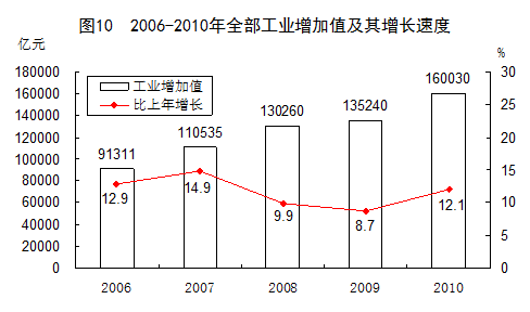全年全部工业增加值160030亿元,比上年增长12.1%。规模以上工业增加值增长15.7%。在规模以上工业中,国有及国有控股企业增长13.7%;集体企业增长9.4%,股份制企业增长16.8%,外商及港澳台商投资企业增长14.5%;私营企业增长20.0%。轻工业增长13.6%,重工业增长16.5%。