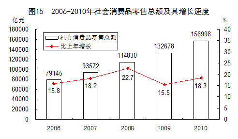 [8]从2010年起,社会消费品零售总额统计采用新的分组,即将经营单位所在地分组由“市”、“县”、“县以下”改为“城镇”、“乡村”;取消按行业分组,新设按“商品零售额”和“餐饮收入额”两种消费形态的分组。