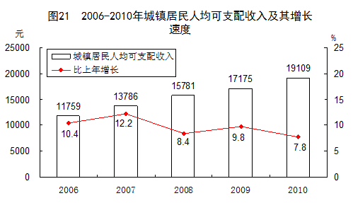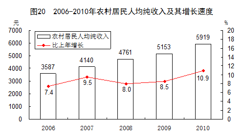 全年农村居民人均纯收入5919元,剔除价格因素,比上年实际增长10.9%;城镇居民人均可支配收入19109元,实际增长7.8%。农村居民家庭食品消费支出占消费总支出的比重为41.1%,城镇为35.7%。按2010年农村贫困标准1274元测算,年末农村贫困人口为2688万人,比上年末减少909万人。