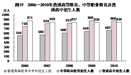 全年研究生教育招生53.8万人,在学研究生153.8万人,毕业生38.4万人。普通高等教育本专科招生661.8万人,在校生2231.8万人,毕业生575.4万人。各类中等职业教育招生868.1万人,在校生2231.8万人,毕业生659.2万人。全国普通高中招生836.2万人,在校生2427.3万人,毕业生794.4万人。全国初中招生1716.6万人,在校生5279.3万人,毕业生1750.4万人。普通小学招生1691.7万人,在校生9940.7万人,毕业生1739.6万人。特殊教育招生6.5万人,在校生42.6万人。幼儿园在园幼儿2976.7万人。