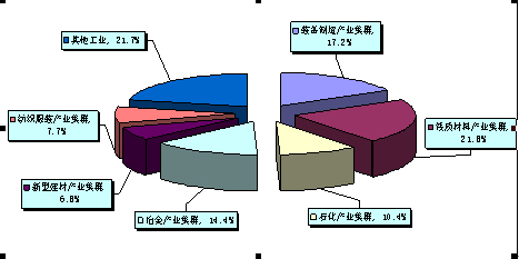 六大产业集群实现工业增加值同比增长22.2%。装备制造产业增加值比上年增长33.9%,占规模以上工业增加值的比重达到17.2%。其中,通用设备制造业增加值增长38.6%,专用设备制造业增加值增长37.8%,交通运输设备制造业增加值增长46.0%,通信设备、计算机及其他电子设备制造业增加值增长35.5%,金属制品业增加值增长22.9%,仪器、仪表及文化、办公用机械制造业增加值增长44.6%。冶金产业增加值比上年增长16.3%,占规模以上工业增加值的比重为14.4%。石化产业增加值比上年增长13.2%,占规模以上工业增加值的比重为10.4%。镁质材料产业集群增加值比上年增长20.5%,占规模以上工业增加值的比重为21.8%;纺织服装产业集群增加值比上年增长21.6%,占规模以上工业增加值的比重为7.7%;新型建材产业集群增加值比上年增长26.5%,占规模以上工业增加值的比重为6.8%。食品饮料及烟草业增加值比上年增长15%,占规模以上工业增加值的比重为6.7%;电力、煤气和水的生产供应业增加值比上年增长27.4%,占规模以上工业增加值的比重为2.7%。