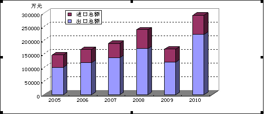 全年进出口总额29.2亿美元,比上年增长74.6%。其中,出口总额22.1亿美元,增长83.8%;进口总额7.2亿美元,增长51.4%,出口大于进口14.9亿美元。在出口总额中,一般贸易出口13.34亿美元,增长52.4%;加工贸易出口3.16亿美元,增长11.3%;其他贸易出口5.56亿美元,比去年同期增长了42.1倍。国有企业出口2.54亿美元,下降1845.6%;外商投资企业出口9.38亿美元,增长27.4%;私营企业出口8.82亿美元,增长282.1%;集体企业出口1.32亿美元,增长70.8%。机电产品出口2.4亿美元,增长60.4 %,占出口总额的11%;镁制品出口6.75亿美元,增长58.8%,占出口总额的30%;纺织服装出口2.06亿美元,下降2.7%,占出口总额的9%。