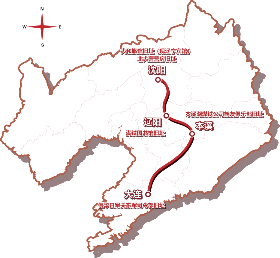 线路节点:侵华日军关东军司令部旧址—满铁图书馆旧址—本溪湖煤铁公司鹤友俱乐部旧址—大和旅馆旧址(现辽宁宾馆)—北大营营房旧址