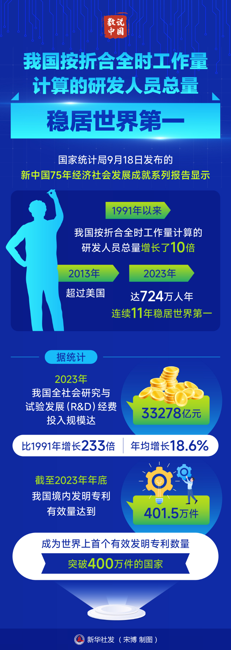 新华社北京9月18日电(记者魏弘毅、潘洁)国家统计局18日发布的新中国75年经济社会发展成就系列报告显示,1991年以来,我国按折合全时工作量计算的研发人员总量增长了10倍,2013年超过美国,2023年达724万人年,连续11年稳居世界第一。