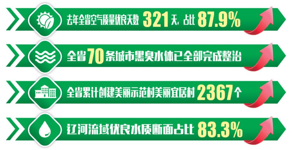 2021年,我省空气质量优良天数321天,比例为87.9%,同比上升4.3个百分点。70条城市黑臭水体已全部完成整治。新建绿色建筑占比达到72%。农村人居环境持续改善,累计创建美丽示范村、美丽宜居村2367个……如今,“天蓝水清地绿”成为辽宁人民切实感受到的实实在在的环境效益。