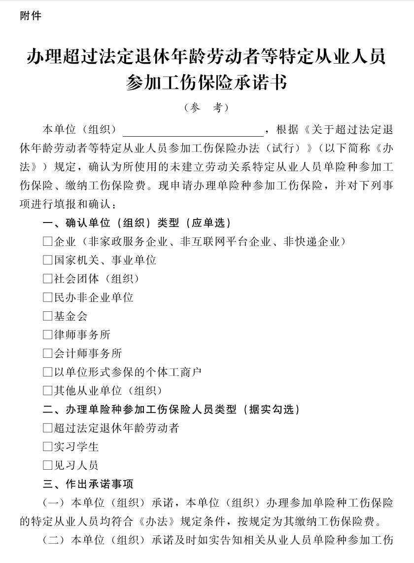 附件:办理超过法定退休年龄劳动者等特定从业人员参加工伤保险承诺书