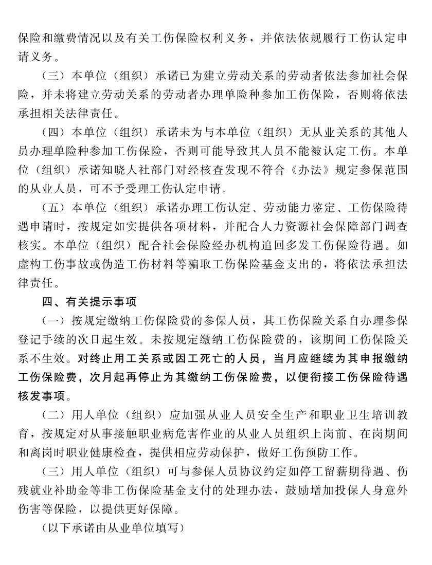 第五条 用人单位申请办理特定从业人员单险种参加工伤保险,应提交《办理超过法定退休年龄劳动者等特定从业人员参加工伤保险承诺书》(见附件),并履行相关承诺;用人单位违反承诺事项或作出虚假承诺的,应承担相应法律责任。