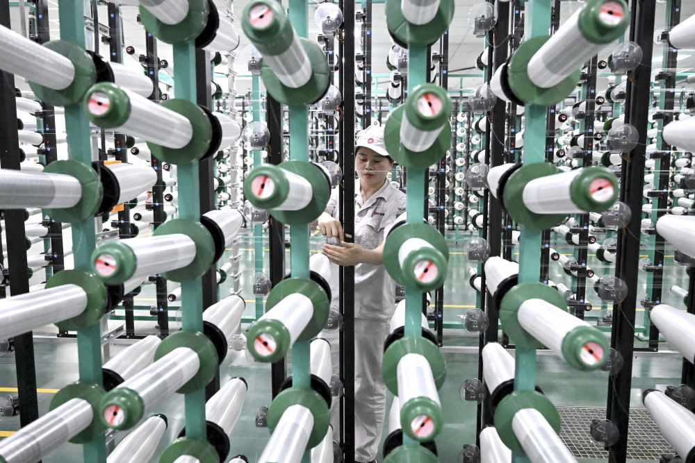 该公司通过自主技术创新,攻克“卡脖子”技术,研发出5G用低介电电子纱、5G用超薄电子布等产品。新华社记者 李安 摄