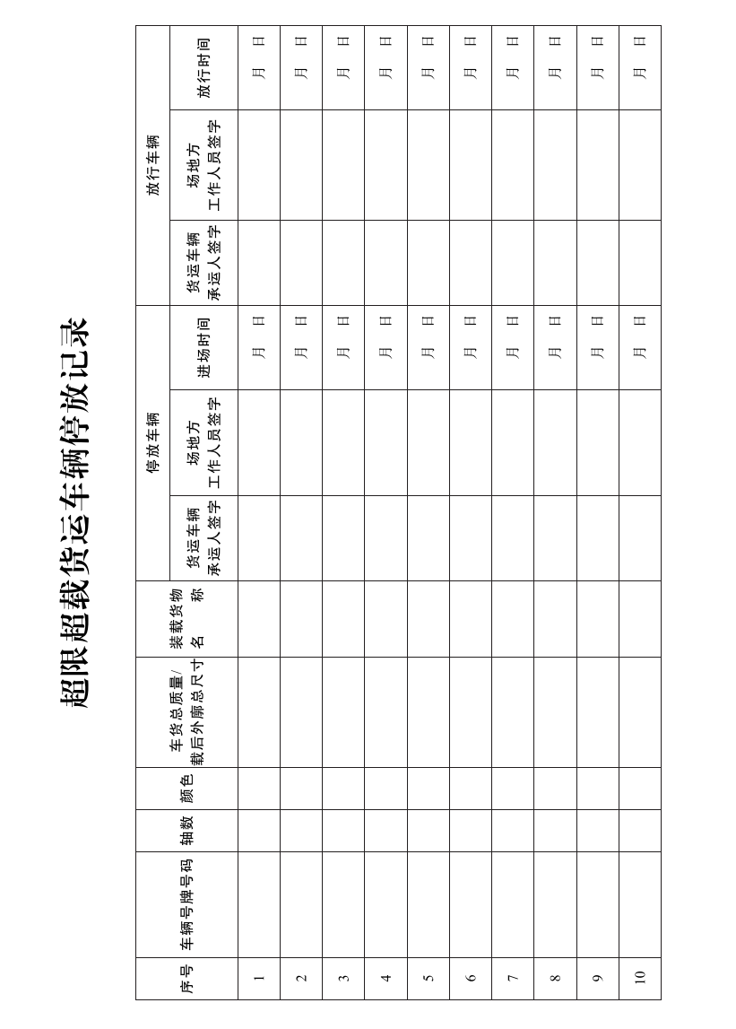 (二)承运人和场地方应当共同查验停放车辆及装载货物,详细登记《超限超载货运车辆停放记录》,准确记录停放车辆号牌号码、轴数、颜色、车货总质量或载后外廓尺寸以及装载货物名称和进场停放时间等信息。查验无误后,由承运人和场地方在《超限超载货运车辆停放记录》“停放车辆”栏签字确认。