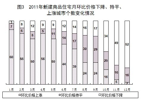 70个大中城市新建商品住宅销售价格月环比下降的城市个数逐步增加。12月份,70个大中城市中,环比价格下降的城市为52个,比1月份增加49个。