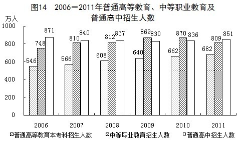 全年研究生教育招生56.0万人,在学研究生164.6万人,毕业生43.0万人。普通高等教育本专科招生681.5万人,在校生2308.5万人,毕业生608.2万人。各类中等职业教育招生808.9万人,在校生2196.6万人,毕业生662.7万人。全国普通高中招生850.8万人,在校生2454.8万人,毕业生787.7万人。全国初中招生1634.7万人,在校生5066.8万人,毕业生1736.7万人。普通小学招生1736.8万人,在校生9926.4万人,毕业生1662.8万人。特殊教育招生6.4万人,在校生39.9万人,毕业生4.4万人。幼儿园在园幼儿3424.4万人。