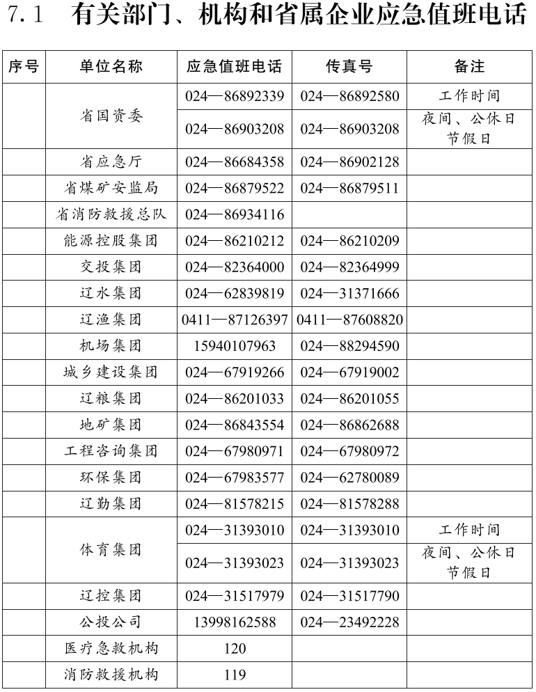 7.1 有关部门、机构和省属企业应急值班电话