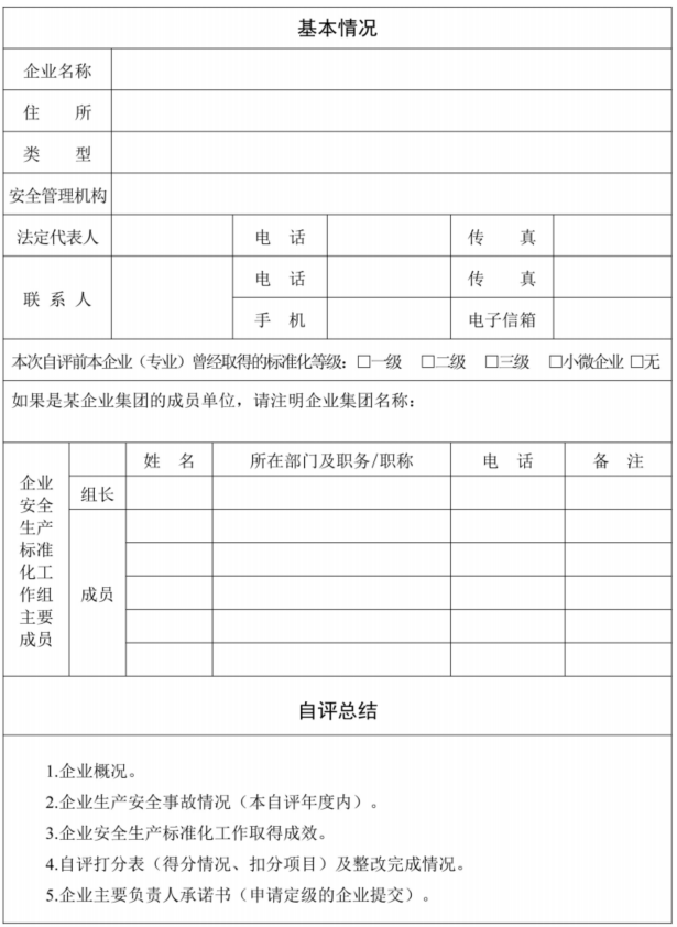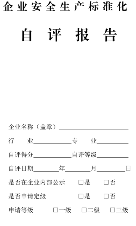 第十三条 自评。企业应当自主开展标准化建设,成立由其主要负责人任组长、有员工代表参加的工作组,按照生产流程和风险情况,编制企业标准化自评工作计划和实施方案,对照标准化相应定级标准对自身安全生产条件及安全管理现状进行诊断,建立并保持全员参与的安全生产管理体系,实现安全管理系统化、岗位操作行为规范化、设备设施本质安全化、作业环境器具定置化。每年至少开展一次自评工作,并形成书面自评报告,在企业内部公示不少于10个工作日,及时整改发现的问题,持续改进安全绩效。