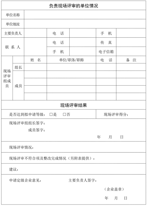 (七)评审完成后,评审组长应总结评审情况、宣布评审结论、提出问题和隐患整改方法、完成整改时限及问题和隐患整改完成后的确认时间等内容。评审组将评审情况及不符合项等形成现场评审问题清单,全体成员须在评审结论上签字,初步确定企业是否达到拟申请的等级,并书面告知企业。