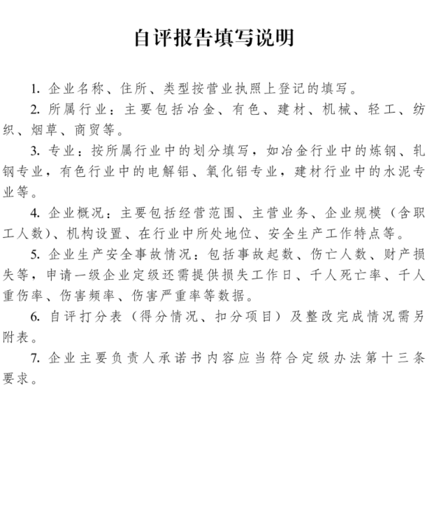 (一)申请定级的企业,依拟申请的等级向定级组织单位提交自评报告,在自评报告中,由其主要负责人承诺符合以下条件:
