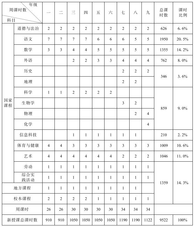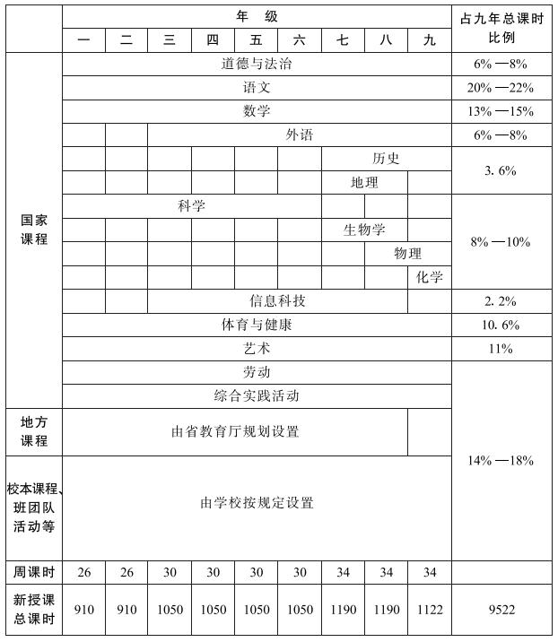 2.一至二年级每周26课时,三至六年级每周30课时,七至九年级每周34课时,九年新授课总课时数为9522。原则上小学每课时按40分钟计算,初中每课时按45分钟计算,学校在保证周总时长不变的情况下,根据课程性质和教学需要,自主确定每节课的具体时长。