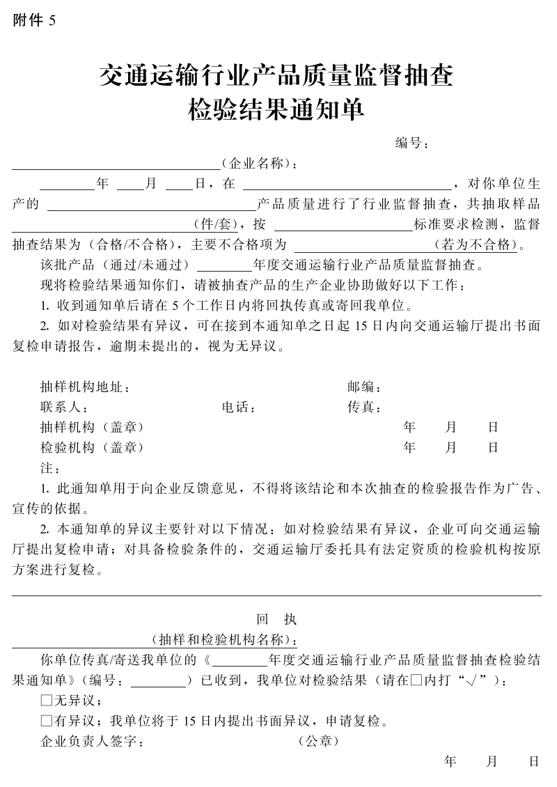 5.交通运输行业产品质量监督抽查检验结果通知单
